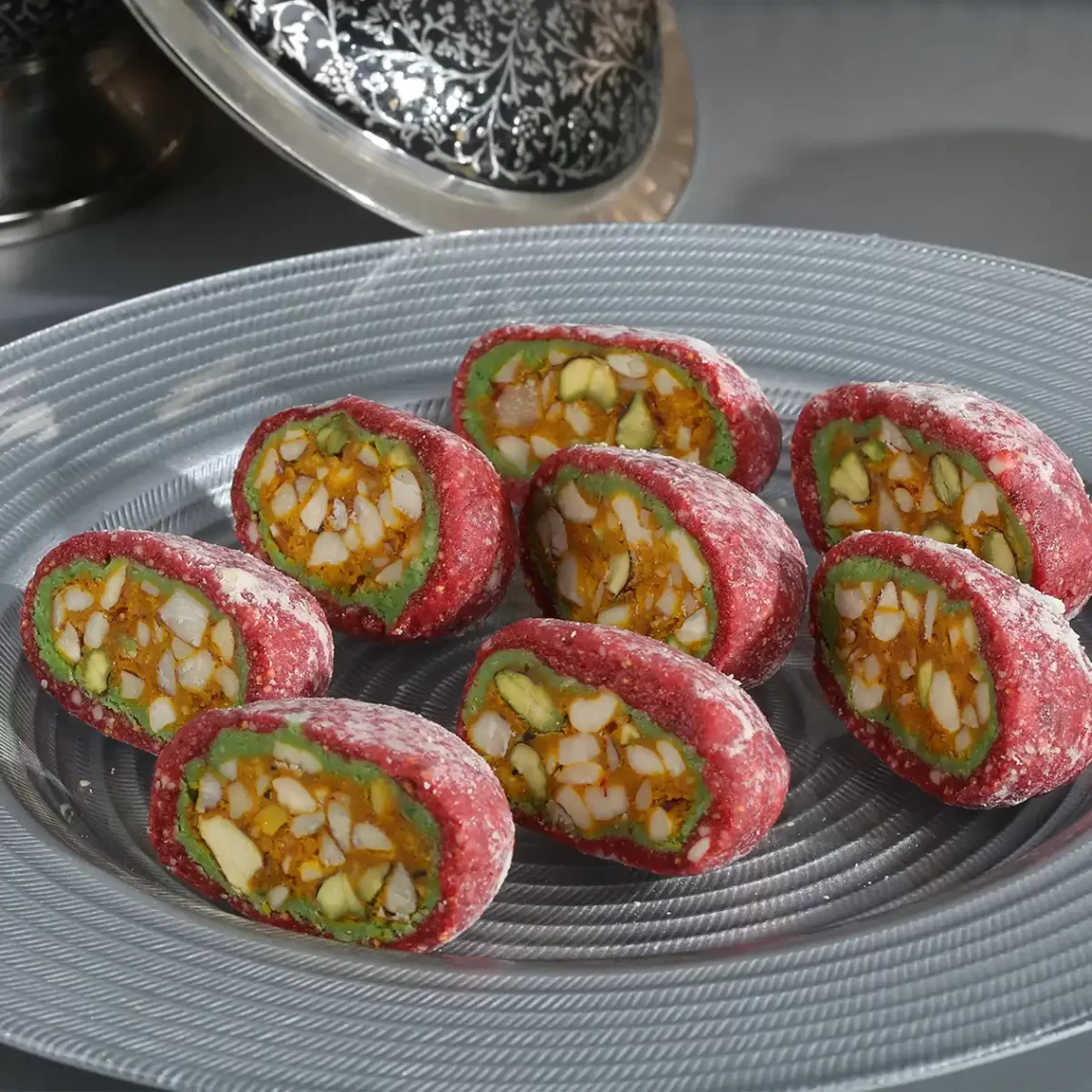 An impeccable fruit & nut treat prepared with a cashew fudge and dried fig base, stuffed with a mixture of chopped cashews almonds and pistachios.
