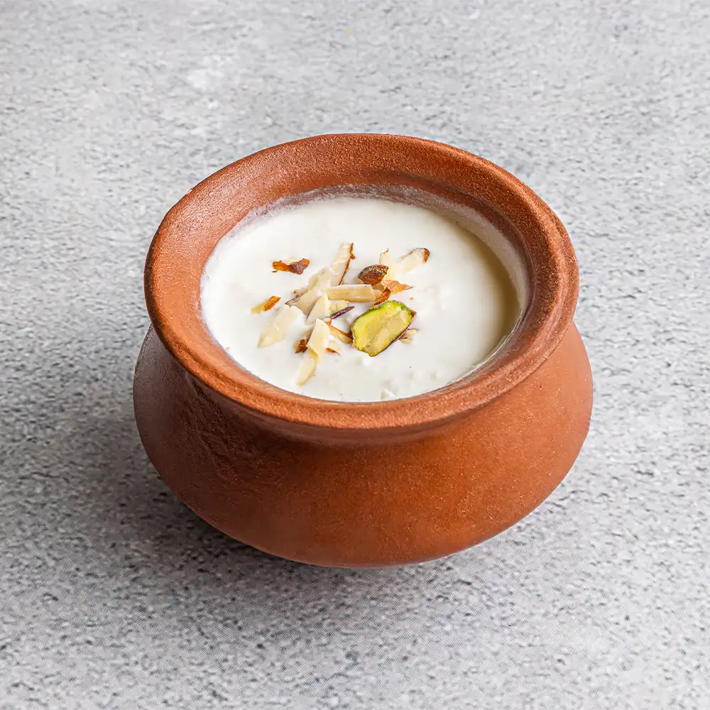 A rich, creamy dessert made with thickened sweetened milk and curd cheese, delicately flavoured with cardamom; set and served in an earthen pot.