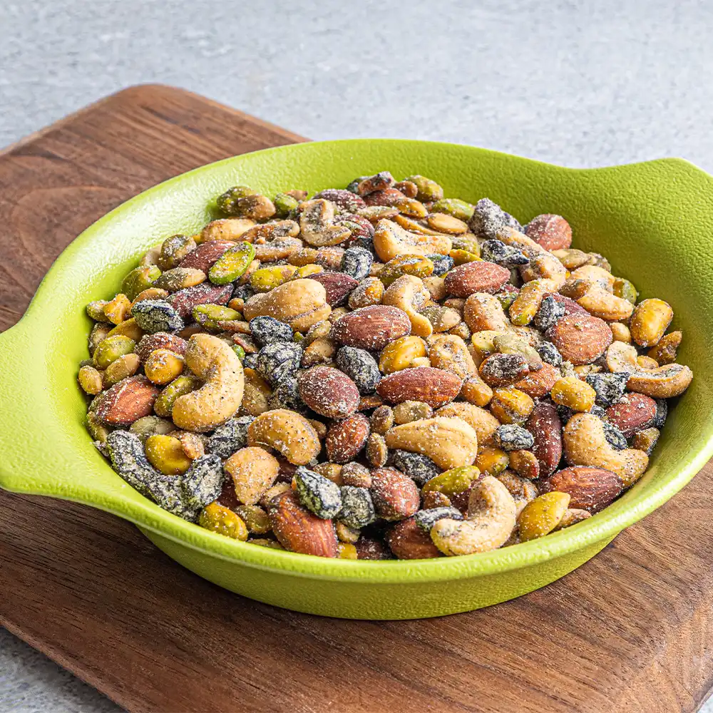 A tangy snack made with a medley of cashews, almonds and raisins tossed in spices for a flavor punch.