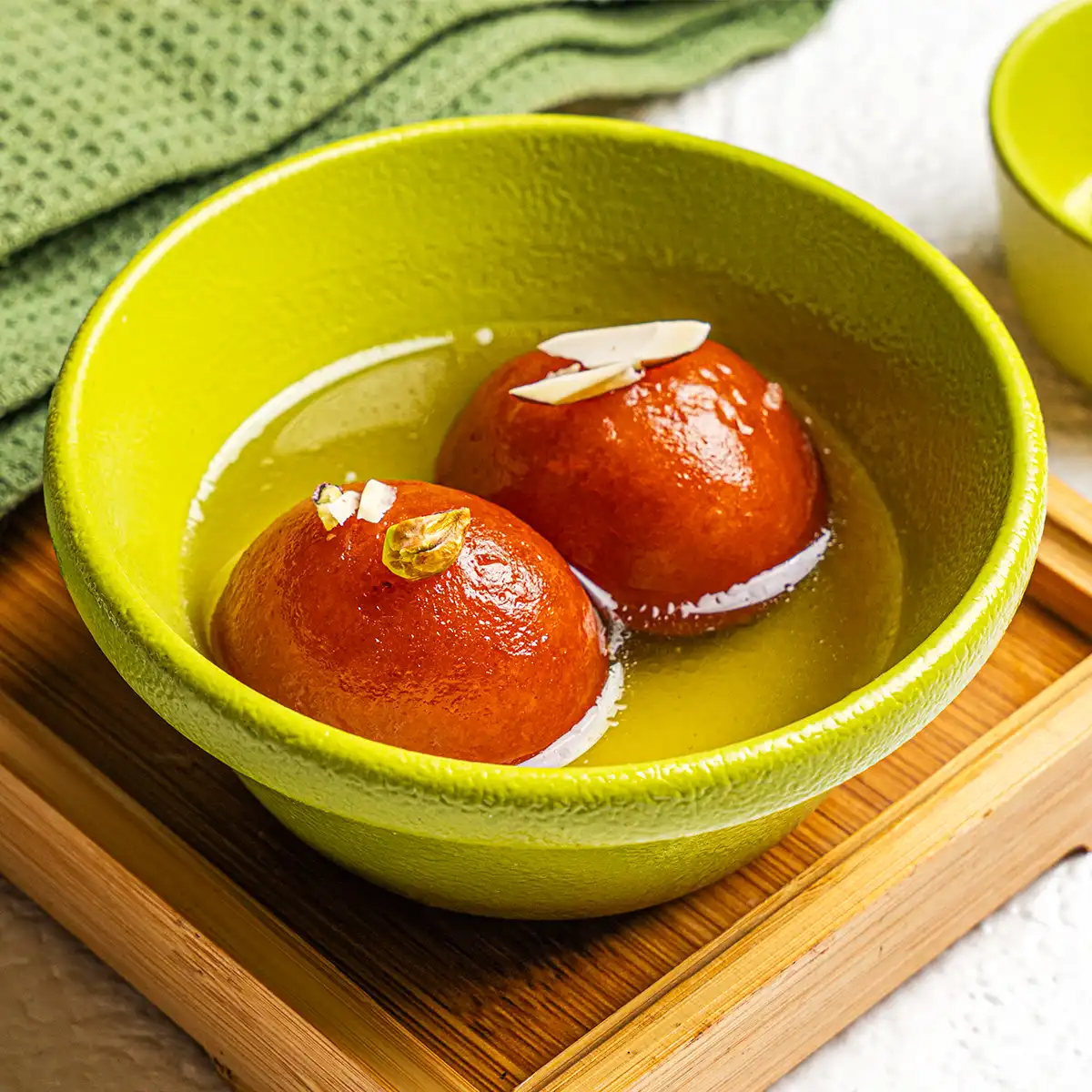 A classic dessert made with a paneer and mawa dough, shaped into balls, deep fried until golden-brown and soaked in a cardamom-infused sugar syrup.