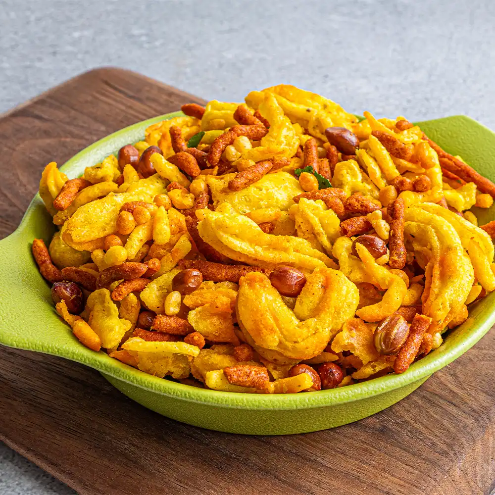 A sweet and savoury mixture of besan sev, besan gathia, besan papdi, boondi, roasted green peas, roasted masoor, roasted chana dal, roasted peanuts and cornflakes.