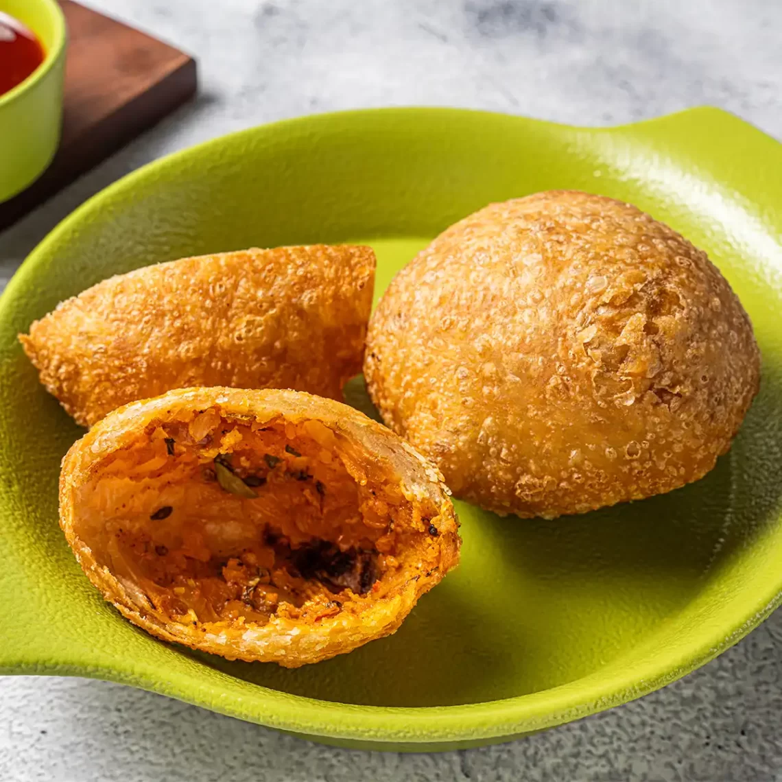 A classic snack made with an outer shell of plain flour, stuffed with a savoury gram flour and moong dal filling; deep fried.