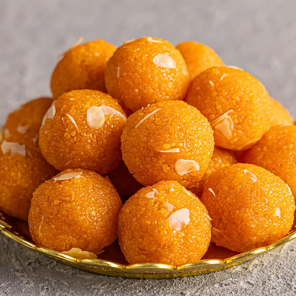 A classic sweet delight made with a gram flour batter, deep fried as tiny pearls, soaked in sugar syrup and shaped into laddoos.